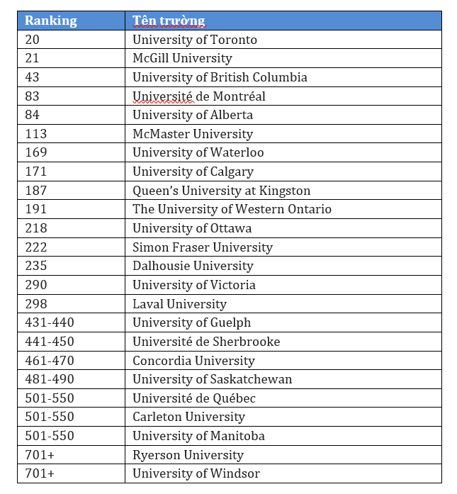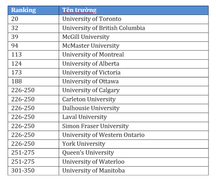 Các cơ sở giáo dục không được chính thức xếp hạng ở Canada, vì tất cả các cơ sở giáo dục đều có các chương trình đào tạo có chất lượng cao. Khi chọn trường học của bạn ở Canada, hãy xem xét loại trường, cỡ trường và vị trí của trường (thường xét theo tỉnh bang/ khu vực). EDS xin giới thiệu một số bảng xếp hạng uy tín để bạn tham khảo, cân nhắc trước khi chọn lựa trường phù hợp với mình.